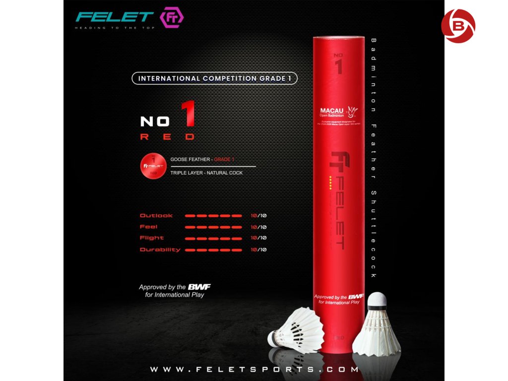 Top-of-the-line Felet No. 1 (Red) feather shuttlecocks offer maximum flight control, consistency, and reliability expected by professional players at the highest level. They are BWF approved and used, for example, at the Macau Super Series 300 tournament.