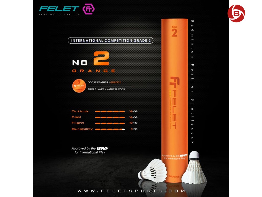 High-quality Felet No. 2 (Orange) feather shuttlecocks offer excellent flight characteristics, control, and consistency, as required by professional and competitive players. They are BWF approved and designed for use in top-level tournaments.