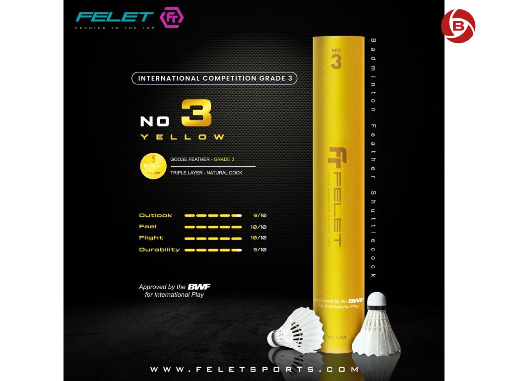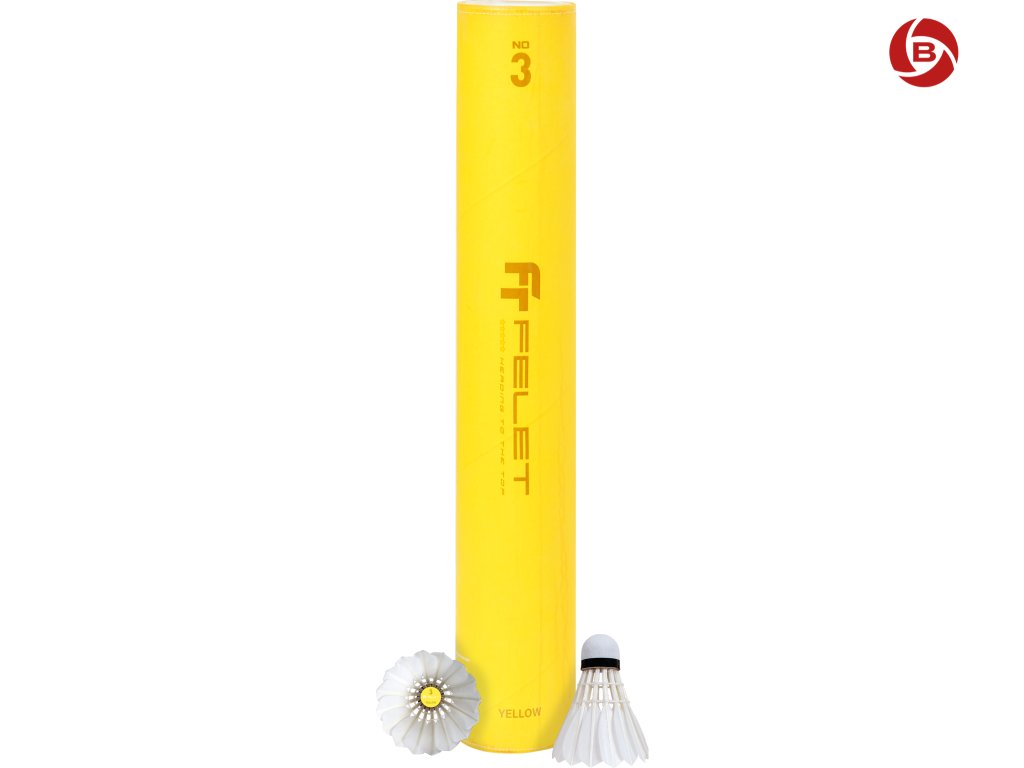 Felet No. 3 (Yellow) feather shuttlecocks offer excellent flight characteristics, consistency, and stability, as expected by performance and competitive players. They are BWF approved and meet the demanding requirements for use in tournaments and league competitions.