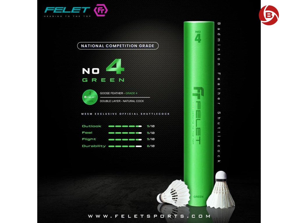 Felet No. 4 (Green) feather shuttlecocks are designed for performance players, junior competitions, and intensive training. Thanks to their balanced ratio of durability and flight characteristics, they are an ideal choice for clubs and players who need a reliable shuttlecock for daily training and regional matches. They last longer than standard recreational shuttlecocks while maintaining consistent flight even with repeated use.
