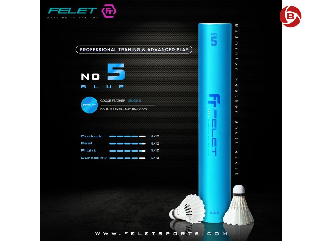 Felet No. 5 (Blue) feather shuttlecocks are an ideal choice for children and junior players, training purposes, and amateur play. With solid construction and reliable flight characteristics, they offer good performance at an affordable price. Suitable for everyday use in clubs, schools, and recreational games.