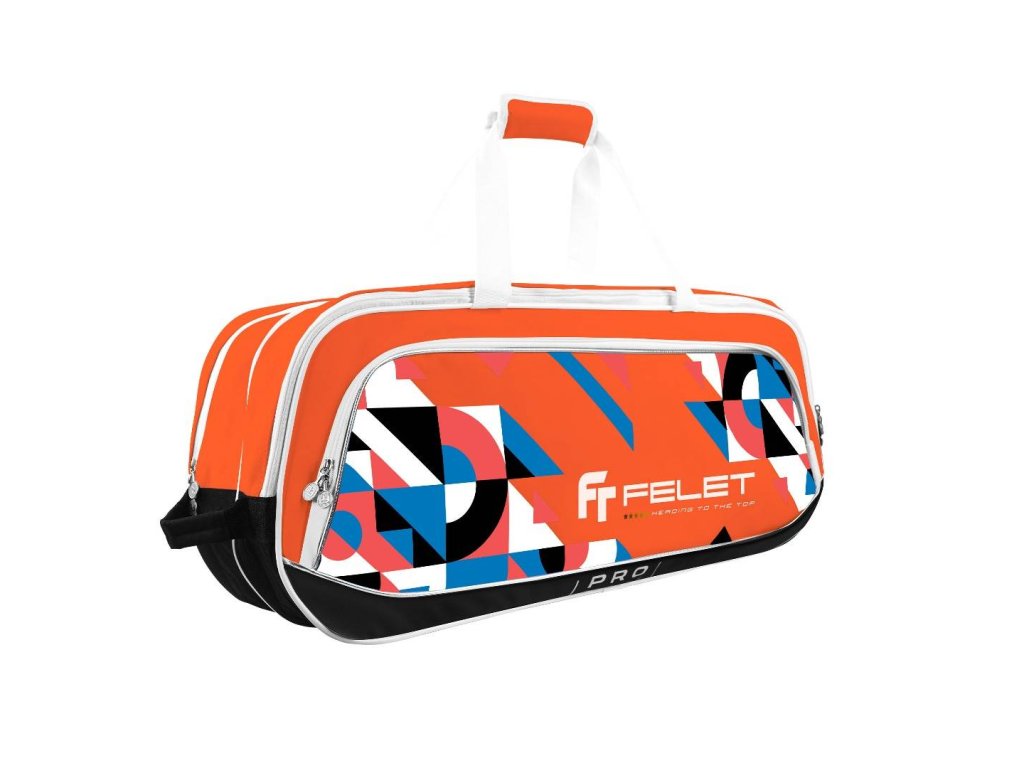 Badmintontasche Felet Tournament Smart Pro Orange ist die ideale Wahl für professionelle und Freizeitspieler, die eine stilvolle und praktische Tasche suchen. Ihr oranges Design mit modernen geometrischen Mustern macht sie sowohl auf als auch abseits des Platzes attraktiv.