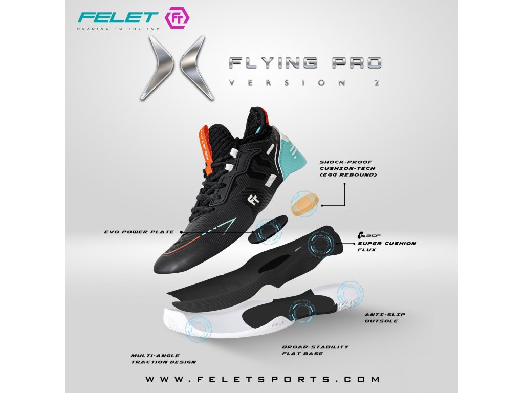 Felet Flying Pro V2 Black indoor shoes represent the second generation of professional badminton footwear designed for intensive match and training use. This model combines modern construction, advanced cushioning technologies, and a bold sporty design that underlines its tournament character.
