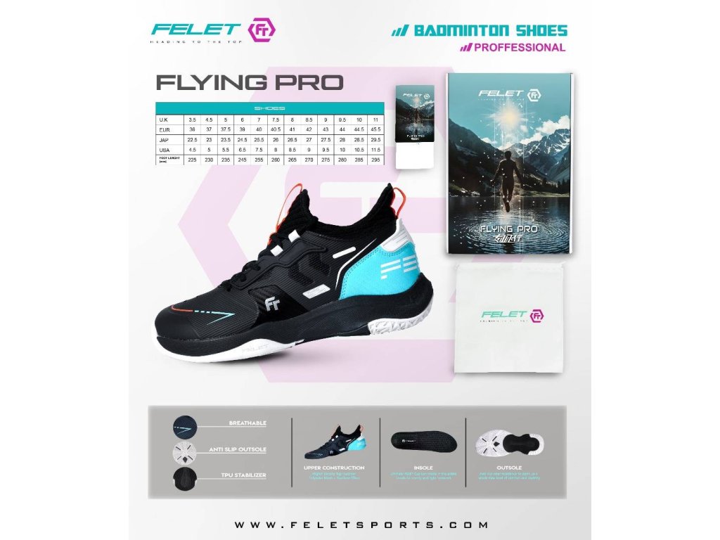 Felet Flying Pro V2 Black is an ideal choice for players seeking professional badminton shoes with modern design, top-level stability, and high comfort. This color version stands out with its technical appearance and timeless color combination suitable for tournament use.
