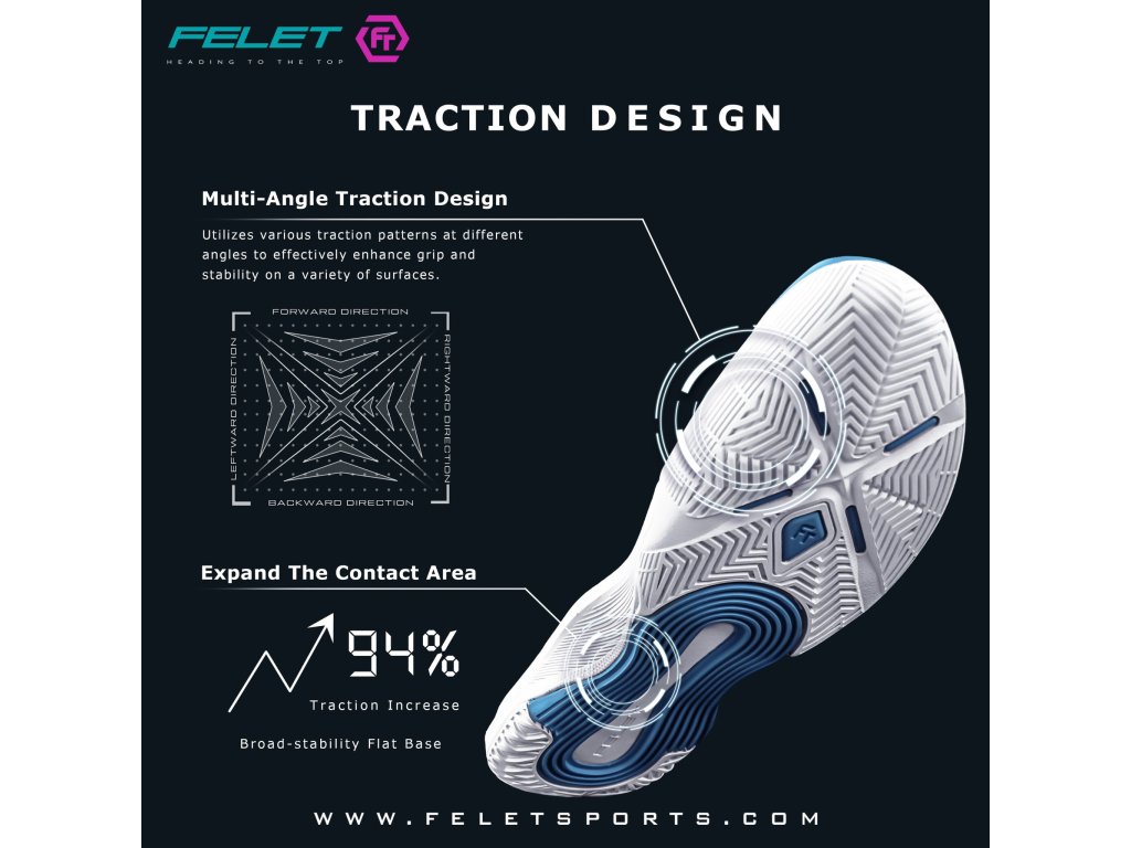 The specially shaped outsole uses a multi-angle traction pattern to ensure maximum grip in all directions of movement.