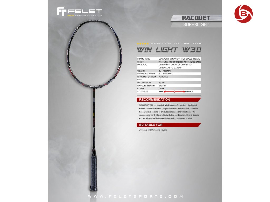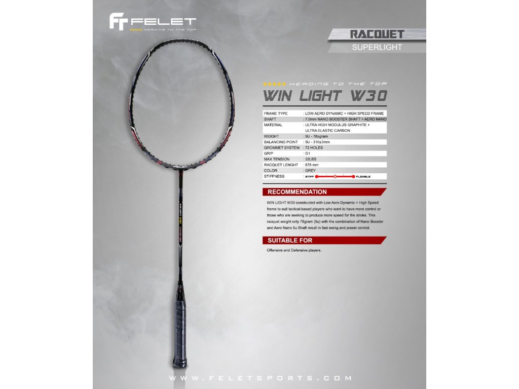Felet Win Light W30 Grey is a badminton racket designed for players who want to combine low weight with attacking performance. With its head-heavy balance and a weight of just 78 grams (5U), it provides excellent manoeuvrability as well as enough power for explosive smashes. Perfect for players who prefer a fast and dynamic game with an emphasis on precision and control.